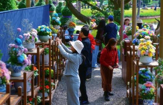 活动现场通过立体花艺与动植物造型等多种手法,打造出错落有致、层次丰富的园林景观。现场展出《菊庐乡韵》《鹿衔菊影》等多组园林小品。本次花展汇集数万盆精品菊花,色彩覆盖黄、粉、红、白、绿、紫等多个色系,品种逾百个,包括红喜鹊、板立黄、梦幻粉水晶、微风弗朗明戈粉及乒乓菊系列等,令人耳目一新。
