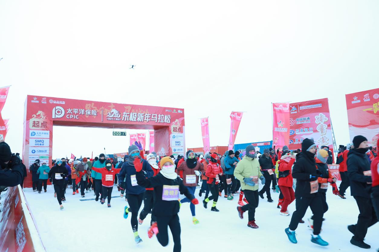 伴随着发令枪响和现场观众的欢呼声,参赛选手迎着新年的第一缕阳光踏上征程,完成“全球三大极点马拉松”之一的荣誉之战。