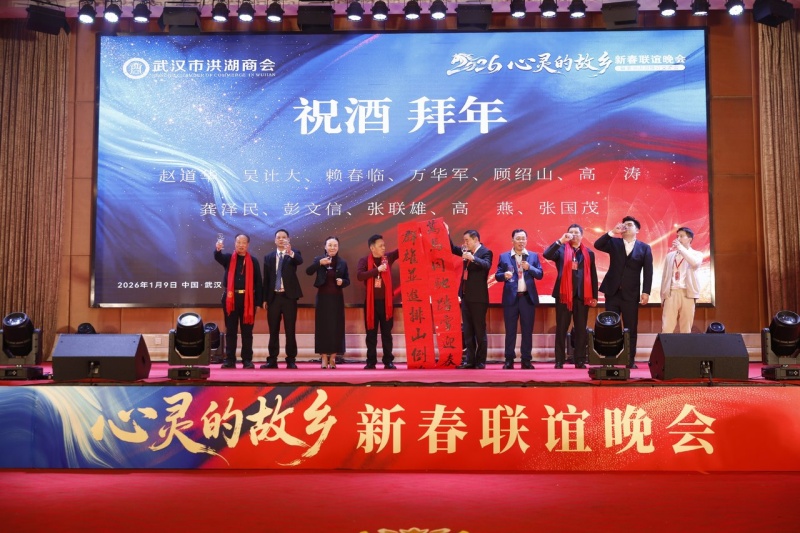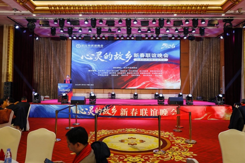 一场主题为“心灵的故乡”、群星璀璨的精彩文艺晚会在盛天网络公司年轻战队的《破阵光年》战鼓舞蹈中拉开帷幕。屏幕上,一群金色的骏马向我们奔驰而来,象征着武汉市洪湖商会全体企业家同心同德,万马同驰,踏雪迎春,奔向充满希望的2026年!