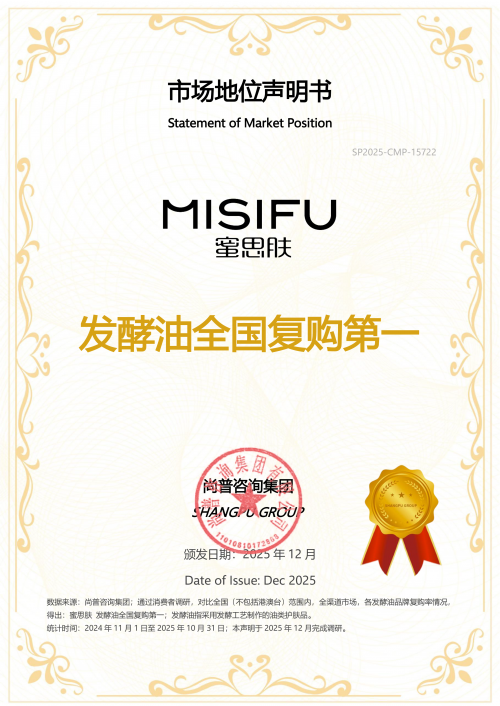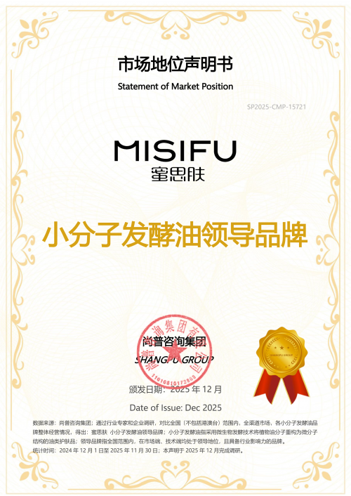 2026年1月,蜜思肤获知名权威咨询机构——尚普咨询集团正式授予的市场地位声明,一举斩获【发酵油全国复购第一】和【小分子发酵油领导品牌】两大权威市场地位声明,用产品实力与市场表现验证了品牌在细分赛道中已建立起显著的标杆地位,同时也展现出消费者深层信赖与行业引领姿态。