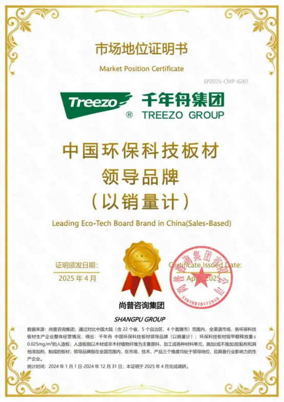 2025年4月,尚普咨询集团向千年舟颁发市场地位声明书。此次千年舟荣获尚普咨询【千年舟 中国环保科技板材领导品牌(以销量计)】市场地位声明,标志着千年舟在板材行业中的卓越地位及市场的高度认可。