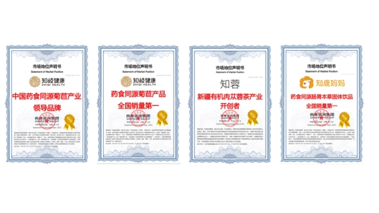 2025年9月,尚普咨询集团向知岐健康集团(以下简称“知岐健康”)颁发了【知岐健康,中国药食同源菊苣产业领导品牌】【知岐健康,药食同源菊苣产品全国销量第一】【知蓉,新疆有机肉苁蓉茶产业开创者】【知鹿妈妈,药食同源肠胃本草固体饮品全国销量第一】的市场地位声明书。