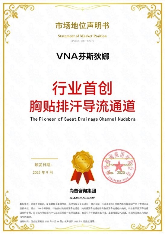 近期,尚普咨询集团向汕头市兰斯佰蒂服饰有限公司旗下专业胸贴品牌VNA芬斯狄娜,颁发市场地位声明。此次,经过严密的数据考证,尚普咨询集团确认向VNA芬斯狄娜授予【VNA芬斯狄娜,行业首创胸贴排汗导流通道】。VNA芬斯狄娜凭借其前沿的设计理念和不懈的开发,实现了胸贴排汗导流通道的行业首创。