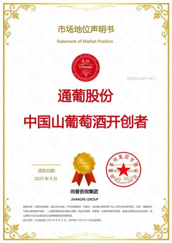 此次通葡股份获颁尚普咨询【通葡股份 中国山葡萄酒开创者】及【通葡股份 中国冰酒开创者】两项市场地位声明,标志着其在山葡萄酒与冰酒领域的领先地位,亦反映了市场对其品牌的高度认可。