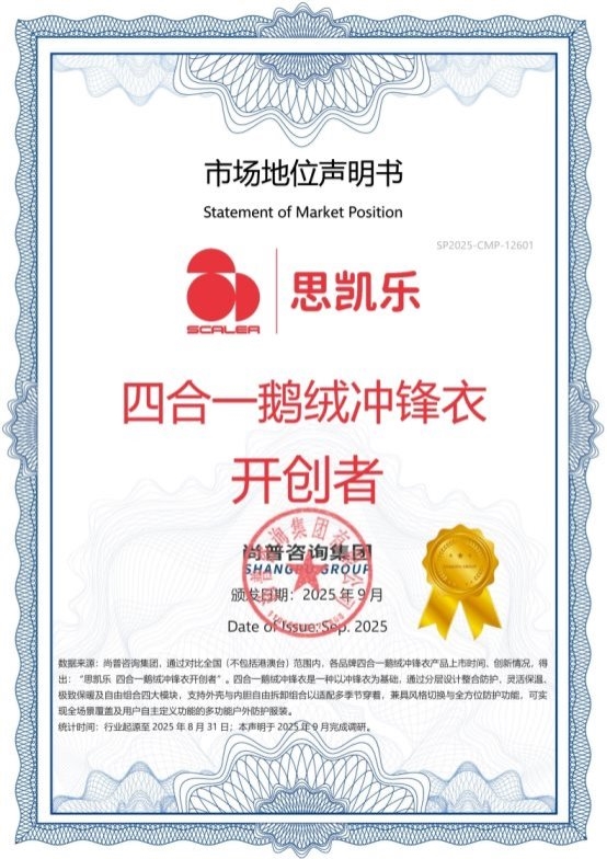 2025年9月,尚普咨询集团对冲锋衣市场开展了专项研究,从行业趋势、竞争格局、企业经营等方面针对行业进行了全面、系统、深入的调研,以呈现思凯乐在行业中的市场地位。此次思凯乐荣获尚普咨询【思凯乐 四合一鹅绒冲锋衣开创者】市场地位声明,标志着思凯乐在行业中的领先地位。