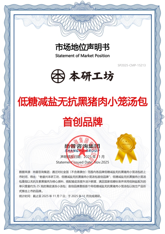 2025年11月,尚普咨询集团正式授予上海老盛兴餐饮管理有限公司旗下品牌“本研工坊” 【低糖减盐无抗黑猪肉小笼汤包首创品牌】市场地位认证。此次获证,不仅是对“本研工坊”在该细分品类中市场领先地位的权威认可,更彰显了其在产品健康化创新方面的卓越成就。