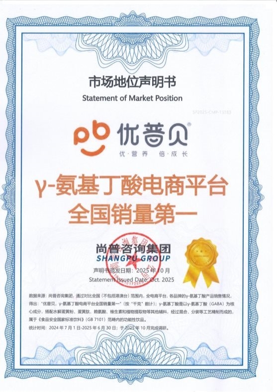2025 年 10 月,尚普咨询集团向武汉优普贝品牌运营管理有限公司正式颁发【优普贝 γ-氨基丁酸电商平台全国销量第一】市场地位声明书。这不仅是对优普贝品牌综合实力的肯定,更印证了其在 γ-氨基丁酸细分赛道的领先地位。依托深厚的专业积淀与持续创新,优普贝已形成从原料筛选、配方研发到品质管控的全链路解决方案;凭借对氨基丁酸作用机制与场景的深入研究,其产品以差异化优势在电商平台上脱颖而出,成为消费者购买氨基丁酸品类的头部品牌。