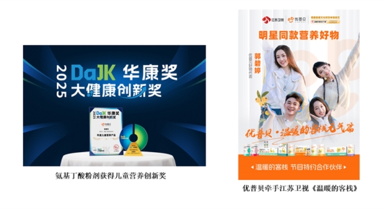 优普贝在大健康与品牌传播领域表现亮眼,一方面其氨基丁酸粉剂斩获 2025 DaJK 华康奖大健康创新奖中的儿童营养创新奖,凸显产品在儿童营养研发上的创新实力;另一方面携手江苏卫视《温暖的客栈》成为节目特约合作伙伴,邀请演员郭碧婷担任优质好物推荐官,推出 “明星同款营养好物”,借明星效应与热门综艺实现品牌与产品的广泛传播,多维度提升品牌影响力。