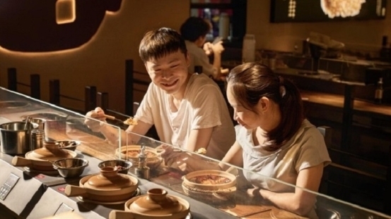 煲仔皇推出的“围炉烹饪”模式,将传统“明厨亮灶”升级为桌边现煮。店员在顾客面前完成烹饪全过程,食材与步骤完全透明,有效建立品牌信任。顾客可通过“视听闻触”全方位感受烹饪过程:“滋啦”声响、升腾蒸汽与定制砂锅共同营造沉浸式仪式感,强化品质认知。店内采用U型布局,顾客环绕烹饪区落座,不仅提升空间利用率,也缩短传餐路径,实现高效出餐。