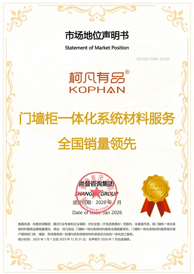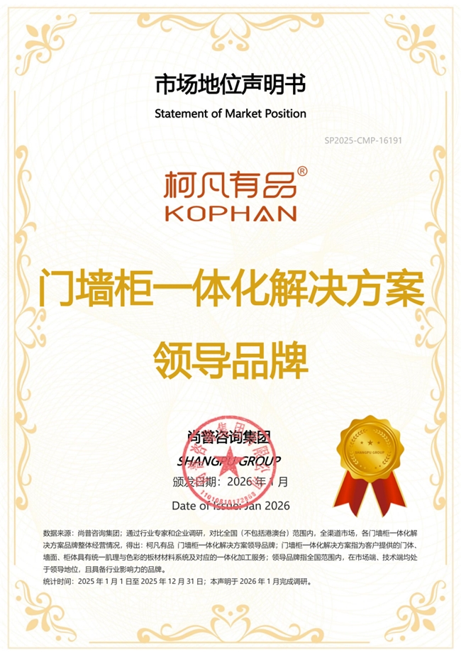 2026年1月,尚普咨询集团向柯凡有品颁发市场地位声明书。柯凡有品荣获【柯凡有品 门墙柜一体化系统材料服务全国销量领先】【柯凡有品 门墙柜一体化解决方案领导品牌】两项市场地位声明,标志着其在门墙柜一体化行业的地位及市场的高度认可。