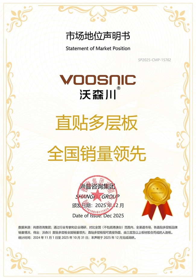 2025年12月,尚普咨询集团向沃森川颁发市场地位声明书。沃森川荣获【沃森川 中国直贴多层板领导品牌】【沃森川 直贴多层板全国销量领先】两项市场地位声明,标志着其在直贴多层板行业的标杆地位及市场的高度认可。