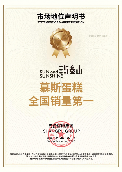 2026年1月,尚普咨询集团向三与叁山颁发市场地位声明书。三与叁山荣获【三与叁山 慕斯蛋糕全国销量第一】市场地位声明,标志着其在蛋糕行业的标杆地位及市场的高度认可。
