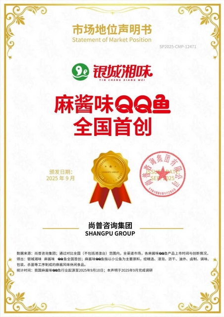 2025年8月,尚普咨询集团向湖南银城湘味食品有限公司颁发【火鸡味QQ鱼全国首创】和【麻酱味QQ鱼全国首创】双项市场地位声明书。此项声明不仅记录了鱼制品品类的味觉革命,更是对一种产业精神的加冕——在速食文化盛行的时代,仍有人愿为湖湘风味的传承深耕十余载春秋。