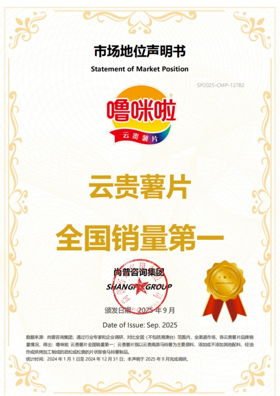 2025年9月,尚普咨询集团正式向云南理世实业(集团)有限责任公司旗下品牌噜咪啦颁发【云贵薯片开创者】和【云贵薯片全国销量第一】两项市场地位声明书。双重声明不仅确认了噜咪啦作为云贵薯片开创者的历史地位,更记录了其全国销量第一的市场表现,彰显消费者对品牌所代表的云贵地道风味与品质的高度认可。