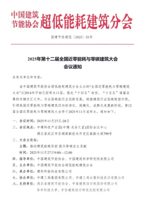 由中国建筑节能协会超低能耗建筑分会主办的“全国近零能耗与零碳建筑大会”从2014年开始已经举办11届。值此“十四五”收官,“十五五”谋篇启幕的关键交汇之年,为全面赋能行业创新发展,助推建筑行业低碳转型升级,引领我国近零能耗与零碳建筑迈向标准化、规模化、成熟化发展新阶段,第12届全国近零能耗与零碳建筑大会将于2025年11月底举办,通知如下。