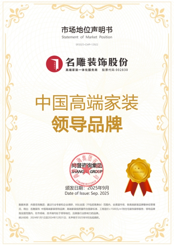 2025年9月,尚普咨询集团向名雕装饰颁发市场地位声明书。名雕装饰荣获【名雕装饰 中国高端家装领导品牌】【名雕装饰 华南高端家装客户满意度第一】两项市场地位声明,标志着其在家装行业的标杆地位及市场的高度认可。