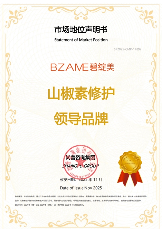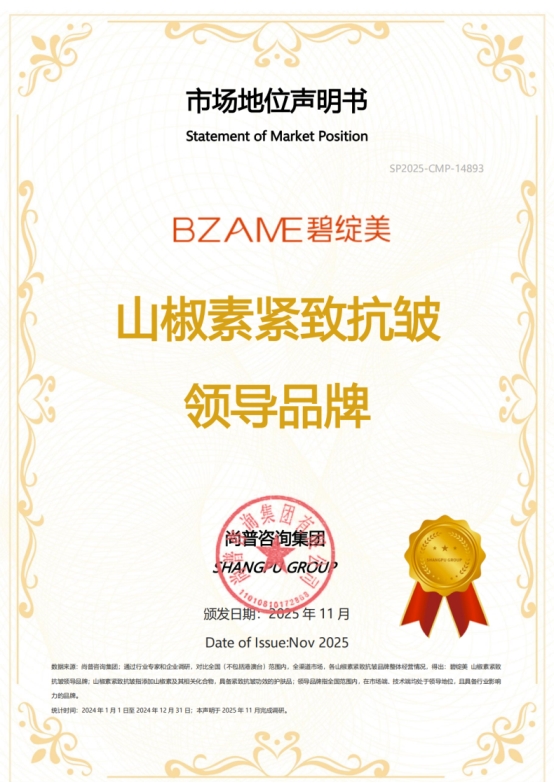 2025年11月,尚普咨询集团向碧绽美颁发市场地位声明书。碧绽美荣获【碧绽美 山椒素护肤品开创者】【碧绽美 山椒素修护领导品牌】【碧绽美 山椒素紧致抗皱领导品牌】三项市场地位声明,标志着其在护肤品行业的标杆地位及市场的高度认可。