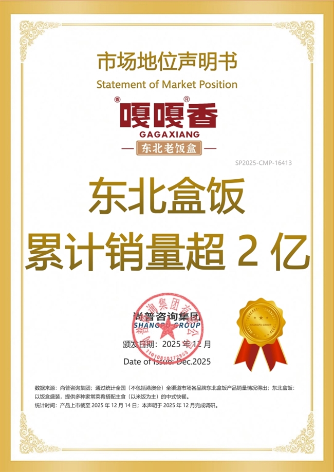 近期,尚普咨询集团向贵州京资餐饮管理有限公司(以下简称“京资餐饮”)颁发市场地位声明。此次,经过严密的数据考证,尚普咨询集团确认向京资餐饮授予【东北盒饭全国销量第一】【东北盒饭,累计销量超2亿】【嘎嘎香东北老饭盒,10个吃过7个回头】【每卖出10份东北老饭盒,6份是嘎嘎香】【东北盒饭消费者首选品牌】权威声明。