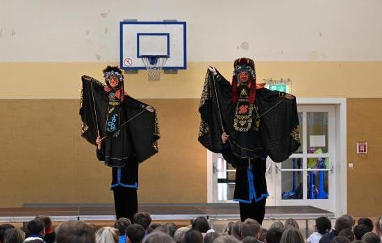 11月21日,艺术团在德国勃兰登堡州巴特利本韦达市(Bad Liebenwerda)的罗伯特·赖斯小学(Grunschulzentrum Robert Reiss)完成了本次德国行的首场演出。礼堂内座无虚席,演出涵盖木偶书法、木偶长绸舞、木偶舞蹈、木偶杂耍及木偶情景剧、川剧绝活等多种艺术形式,演员凭借特色非遗“中型杖头木偶操控技艺”,展现了《木偶书法》《春江花月夜》《变脸》等精彩节目,令观众惊叹不已。