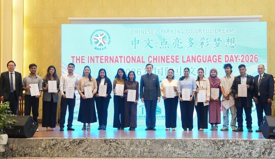 国际网(www.guoji.net.cn)讯:4月26日,2026年国际中文日活动在尼泊尔加德满都谷地城市勒利德布尔举行。来自特里布文大学、加德满都大学、LRI孔子课堂等机构的尼泊尔学员带来中尼特色舞蹈、中文歌曲、诗朗诵和小品等节目,现场还设置书法、茶艺、拓印、投壶等中国文化体验项目。图为中国驻尼泊尔大使张茂明(右八)与13名在中国汉语水平考试中取得优异成绩的尼泊尔学员合影。