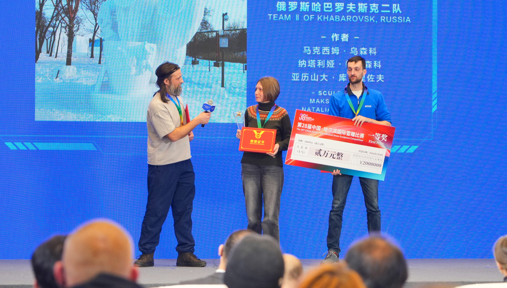 出自俄罗斯哈巴罗夫斯克二队的《单恋》,以绝对票数优势斩获桂冠!该获奖作品,用克制内敛的造型,将单恋的酸涩与遗憾刻画得入木三分。纯净的雪色反衬出情感的浓烈,细腻的肌理暗藏着隐秘的张力,冰雪的清冽质感与作品传递的深沉情绪碰撞出奇妙的火花,不仅征服了全体评委,更让现场观众为之动容。获奖代表接过奖杯时难掩激动,“哈尔滨的冰雪与热情让人难忘,这场艺术交流让他们收获满满,期待明年再赴这场冰雪之约”。