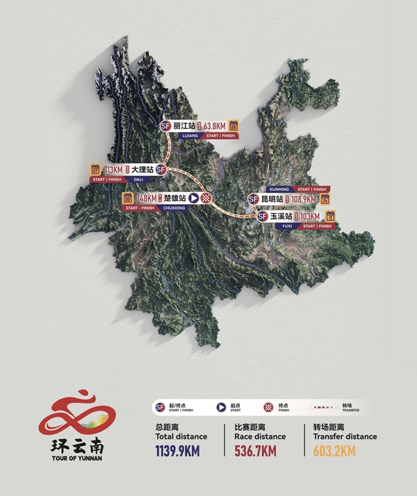 本次“环云南”赛事将严格依照国际自行车运动联盟(UCI)及中国自行车运动协会的相关规定执行。赛事将于12月6日至14日举行,总距离达1139.9公里,其中竞赛距离536.7公里,转场距离603.2公里,设1个揭幕赛段及4个竞赛赛段。五大赛段均经过精心设计,既暗藏竞技挑战,又将云南的地貌奇观与人文底蕴尽数铺展在赛道之上,生动诠释“赛场就是景点、竞赛就是旅游”的办赛理念。