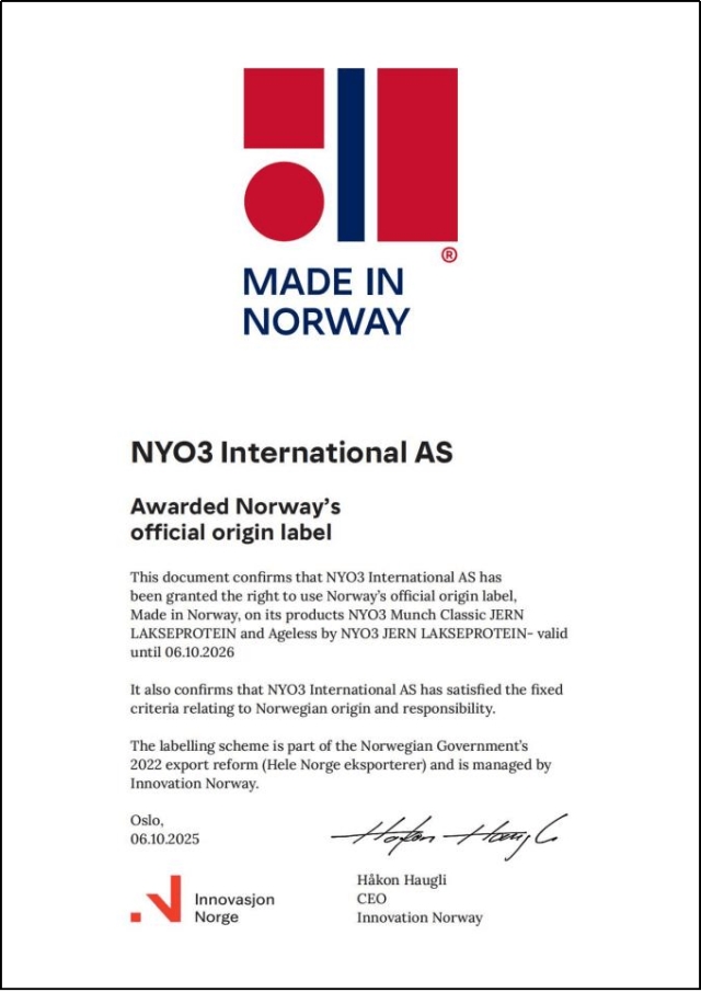对于食品与营养品牌产品的认证标准尤其严格:企业必须确保至少 80% 的可计入原料来自挪威,且关键加工环节必须在挪威本土完成,以保证纯正产地属性与生态可持续性。Ageless挪威三文鱼铁采用可持续三文鱼铁原料,从原料捕捞、加工提取到成品封装均在挪威完成,完全契合“Made in Norway”的严格标准,并成为同品类首个且唯一获此认证的产品。