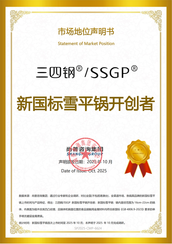 2025年10月,尚普咨询集团向广东三四钢不锈钢实业有限公司(以下简称“广东三四钢”)旗下品牌三四钢®的新国标雪平锅颁发市场地位声明书。此次三四钢®新国标雪平锅系列产品荣获尚普咨询集团【三四钢/SSGP 新国标雪平锅开创者】【三四钢/SSGP 首个使用新国标的雪平锅品牌】权威声明,三四钢®率先推出符合新国标的雪平锅,这不仅是对其研发能力的印证,更以实际行动为行业树立了新的安全与品质标杆。