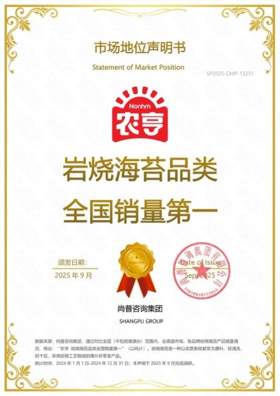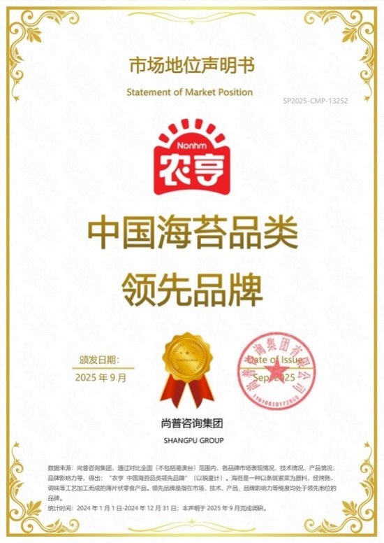 2025年9月,尚普咨询集团对海苔市场开展了专项研究,从行业趋势、竞争格局、企业经营等方面针对行业进行了全面、系统、深入的调研,以呈现农亨在行业中的市场地位。此次,农亨荣获尚普咨询集团颁发的“岩烧海苔品类全国销量第一”及“中国海苔品类领先品牌”市场地位声明,这不仅凸显了农亨的产品创新与市场影响力,更标志着其在海苔领域的领先地位,为海苔行业高质量发展树立了标杆。