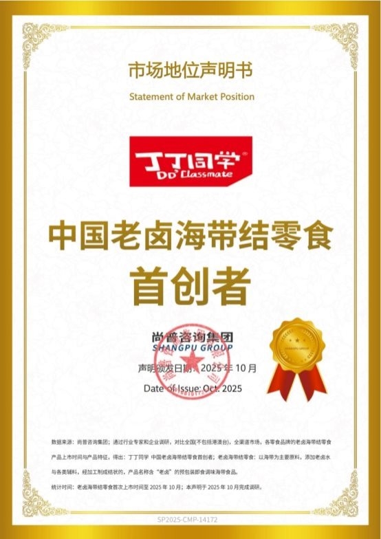 2025年10月,尚普咨询集团向益阳市湘闽食品有限公司(以下简称“湘闽食品”)旗下品牌丁丁同学的老卤海带结零食系列产品颁发市场地位声明书。此次丁丁同学老卤海带结零食系列产品荣获尚普咨询集团【丁丁同学 中国老卤海带结零食首创者】权威声明,充分彰显了湘闽食品的创新引领力与产品创造力。