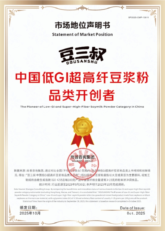 2025年10月,尚普咨询集团对低GI超高纤豆浆粉行业开展了专项研究,从行业趋势、竞争格局、企业经营等方面针对行业进行了全面、系统、广泛而深入的调研,以呈现豆三叔在行业中的市场地位。