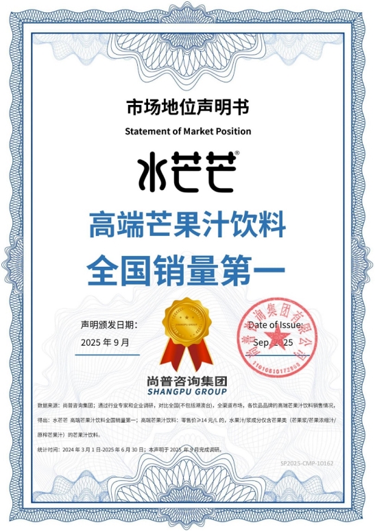 2025年9月,尚普咨询集团向上海水茫茫饮品有限公司(以下简称“水茫茫饮品”)旗下品牌水芒芒的高端芒果汁饮料系列产品颁发市场地位声明书。此次水芒芒高端芒果汁饮料系列产品荣获尚普咨询集团【水芒芒 高端芒果汁饮料全国销量第一】权威声明,不仅彰显了水茫茫饮品在高端芒果汁市场的领先地位,也反映了消费者对其产品的高度认可。