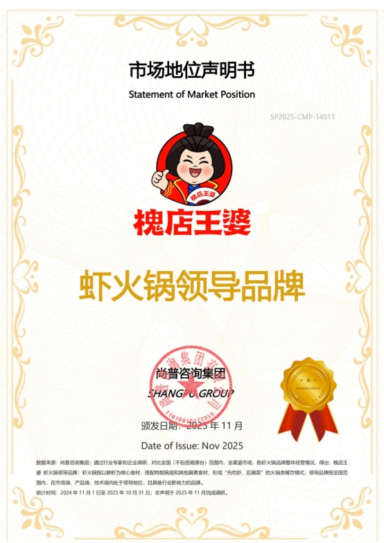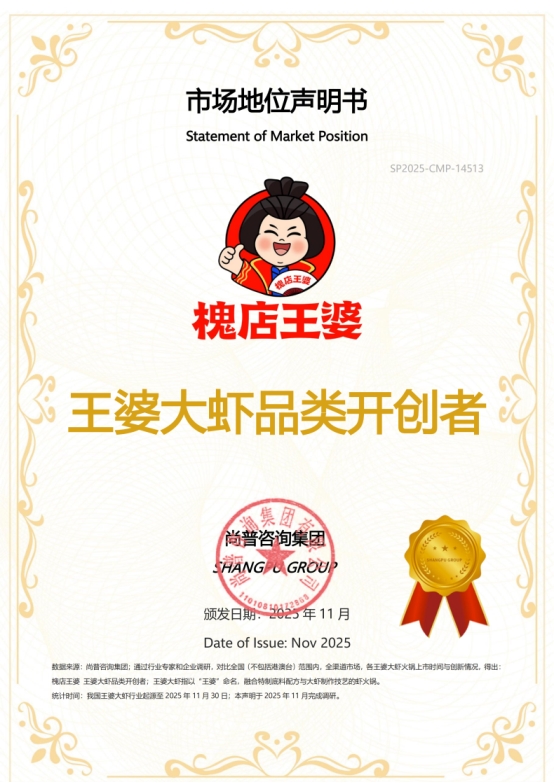 2025年11月,尚普咨询集团向槐店王婆颁发市场地位声明书。槐店王婆荣获【槐店王婆 王婆大虾品类开创者】【槐店王婆 虾火锅口碑第一】【槐店王婆 虾火锅领导品牌】三项市场地位声明,标志着其在虾火锅行业的标杆地位及市场的高度认可。