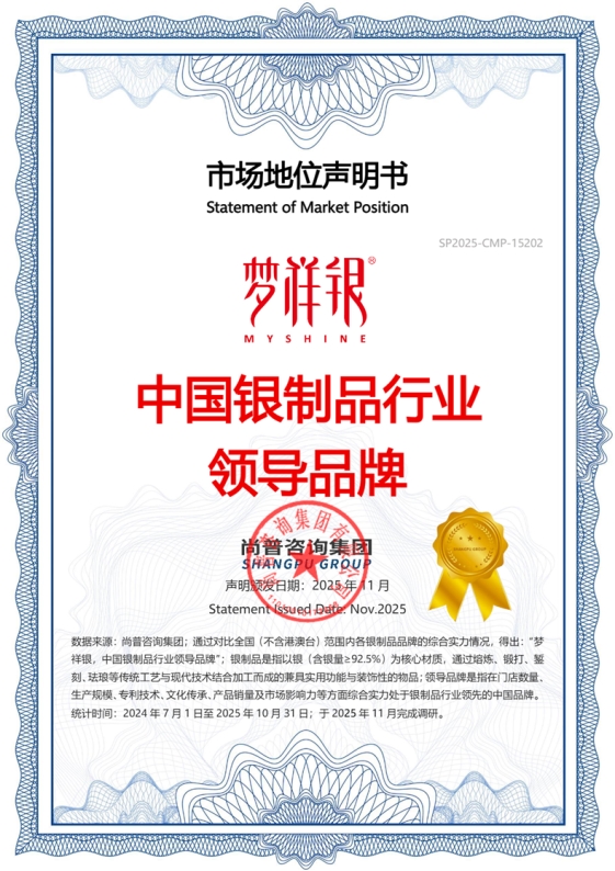 2025年11月,尚普咨询集团向河南梦祥纯银制品有限公司(以下简称:梦祥银)颁发【梦祥银,中国银制品行业领导品牌】市场地位声明书。此次梦祥银荣获尚普咨询集团颁发的市场地位声明书,不仅是对其在银制品设计、研发及全产业链布局上突出成就的充分肯定,更是对其继承和弘扬中国传统文化、坚持卓越匠人精神以及以科技赋能银制品产业升级所发挥的行业引领作用的高度认可。