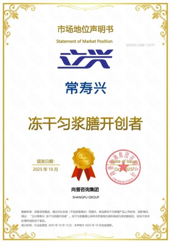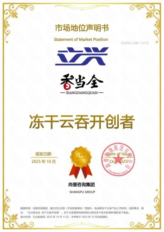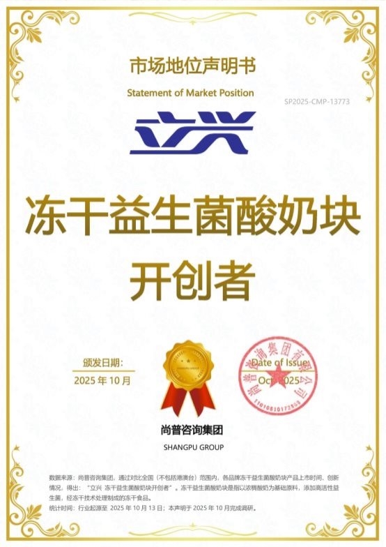 此次立兴荣获尚普咨询【立兴 冻干益生菌酸奶块开创者】【立兴常寿兴 冻干匀浆膳开创者】【立兴香当全 冻干云吞开创者】市场地位声明,标志着立兴在行业中的领导地位,反映了其深受广大消费者认可与喜爱。