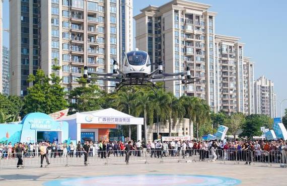 现场汇集了重卡房车、新能源汽车、低空飞行汽车等多种汽车。当天,一辆无人驾驶载人航空器成功在苍海湖旅游区飞行展示,吸引了众多游客的目光。据悉,大会首次引入低空飞行汽车,进一步探索“低空经济+旅游”产业。此外,在“一键游广西”数字体验展区,展示了广西文化旅游大会首次全周期使用的“一键游广西”线上平台,充分体现数字技术在文旅方面的广泛应用。