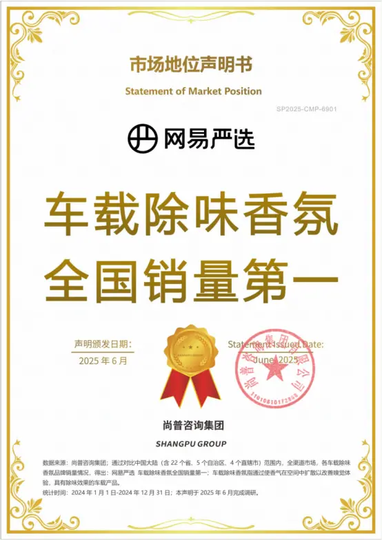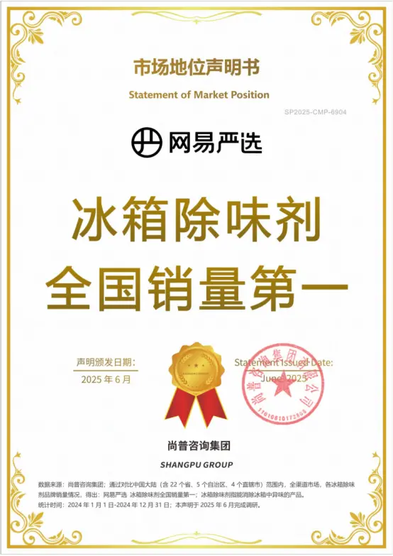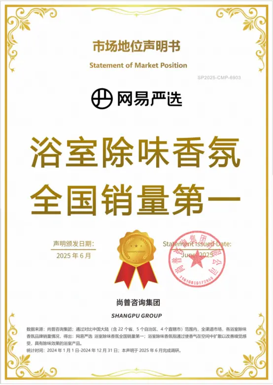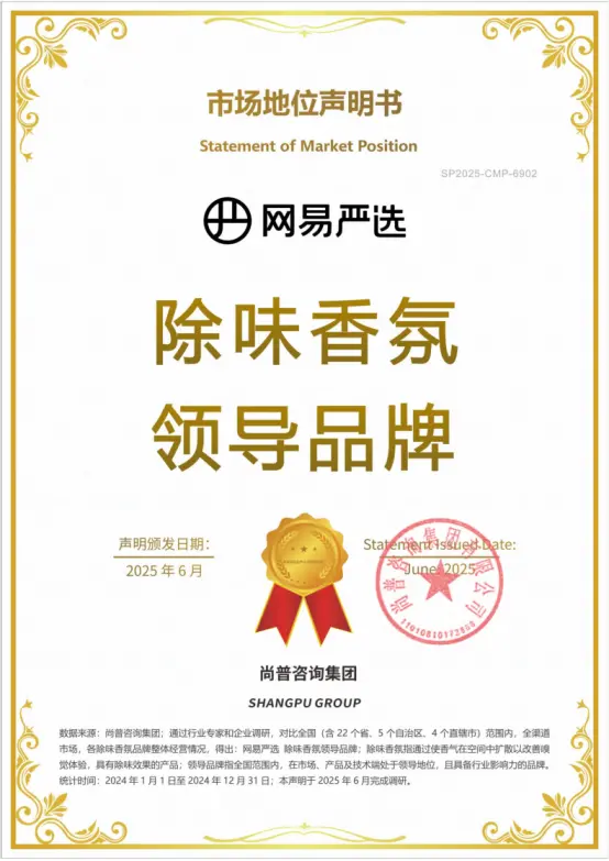 2025年6月,尚普咨询集团向网易旗下生活方式品牌网易严选颁发“网易严选 除味香氛领导品牌”、“网易严选 冰箱除味剂全国销量第一”、“网易严选 浴室除味香氛全国销量第一”、“网易严选 车载除味香氛全国销量第一”四项市场地位声明书。该系列市场地位声明不仅验证了网易严选的市场领导力,更体现了用户的高度认可。