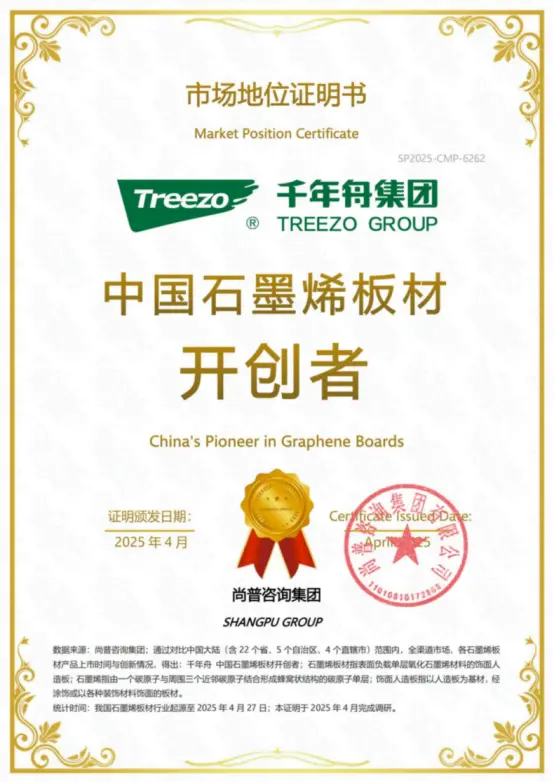 2025年4月,尚普咨询集团向千年舟颁发市场地位声明书。此次千年舟荣获尚普咨询【千年舟 中国石墨烯板材开创者】市场地位声明,标志着千年舟在板材行业中的卓越地位及市场的高度认可。