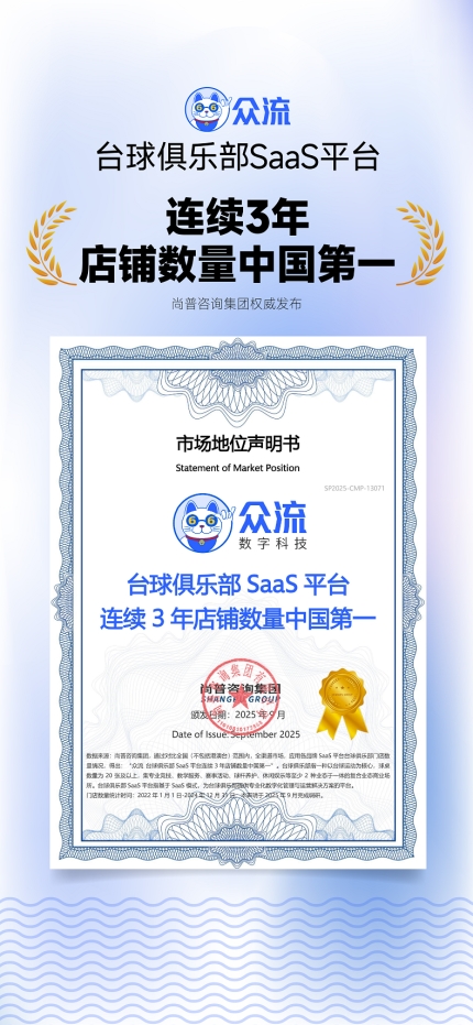 尚普咨询是中国最具领导力和权威性的独立第三方行研与投融资咨询机构之一。在本次调研中,尚普咨询通过对比全国(不包括港澳台)范围内,全渠道市场,2022-2024年应用各品牌SaaS平台台球俱乐部门店数量情况,得出:“众流台球俱乐部SaaS平台,连续3年店铺数量中国第一”。