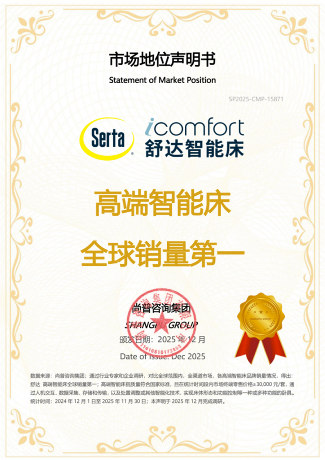 2026年1月,尚普咨询集团向舒达颁发市场地位声明书。舒达荣获【高端智能床全球销量第一】市场地位声明,标志着其在智能床行业的卓越地位及消费者的高度认可与信赖。