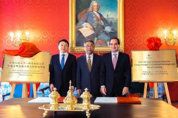 中国人民大学校长马怀德、中国驻葡萄牙大使杨义瑞、科英布拉大学副校长若奥·努诺·卡尔文·达席尔瓦出席仪式并致辞,共同为中葡文明交流互鉴合作研究中心揭牌。