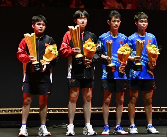 图为林诗栋、王楚钦和陈俊菘、周启豪(从左至右)在颁奖仪式上合影