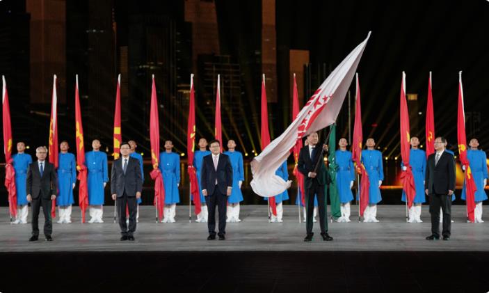 第十五届全运会组委会执行主任、香港特别行政区行政长官李家超致辞说,粤港澳三地首次共同承办全运会圆满成功,共同谱写大湾区融合发展新篇章。让我们将全运会的积极奋斗转化为体育强国建设的奋进动力。