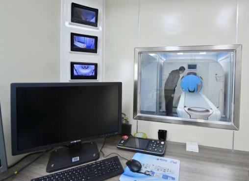 参观者在参观移动医院CT车