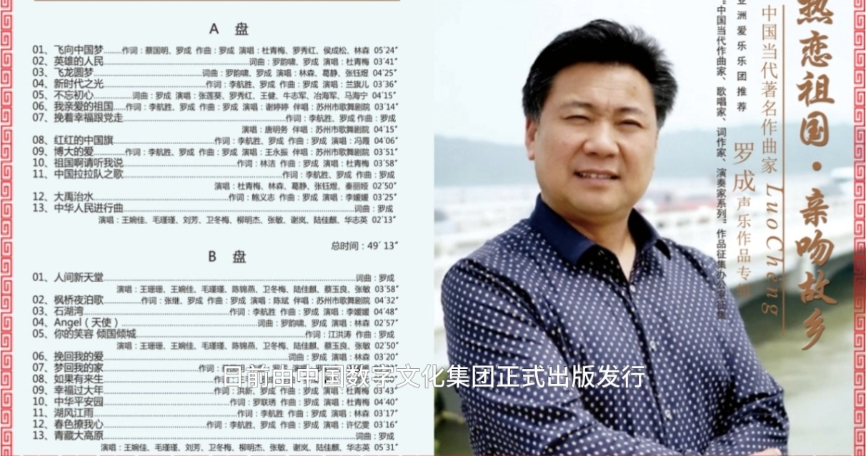 据《中华英才》半月刊网江苏讯(赵伟 郝春玲)著名高原音乐人、国家一级作曲、世界华人音乐家协会副主席罗成先生作词作曲的两套新专辑——《热恋祖国》与《亲吻故乡》,日前由中国数字文化集团正式出版发行。专辑收录了26首代表性歌曲,原中国音乐家协会主席傅庚辰先生亲笔作序,堪称罗成四十余年音乐生涯的又一标志性成果。