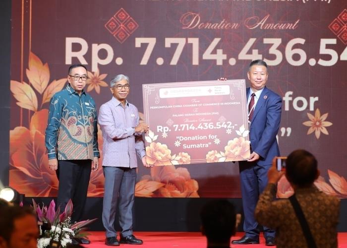 2025年年底,印尼苏门答腊岛多地遭遇持续强降雨,引发严重洪涝灾害。灾情发生后,印度尼西亚中国商会总会迅速组织会员企业开展联合行动,166家中资企业参与捐赠,累计募集善款约77亿印尼盾,由印尼红十字会统一接收并用于灾区救援。图为商会代表向印尼红十字会移交象征性捐赠牌,标志着此前为支持印尼苏门答腊地区洪灾救援所募集善款完成交接。