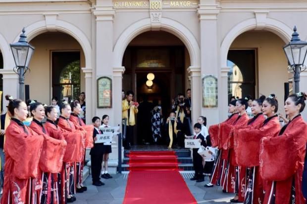 当日上午,位于悉尼西部的帕拉玛塔市政厅外锣鼓喧天、醒狮欢舞,一面面姓氏旗迎风招展,数百名澳大利亚华侨华人代表齐聚于此。