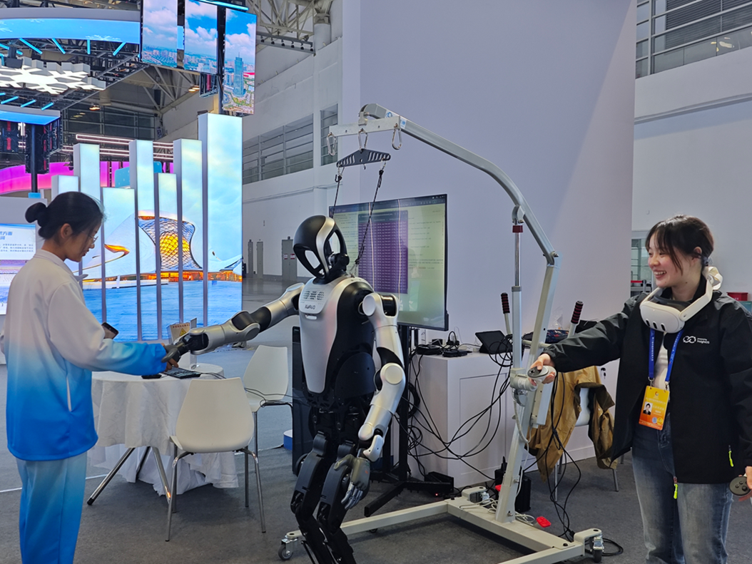 志愿者在“侨智汇”成果发布区体验科技成果。