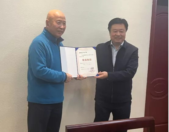 右一贵州交通职业大学党委书记何兴发为中国药食同源生命科学院院长张少堂教授(左一)颁发“客座教授”任期五年证书。